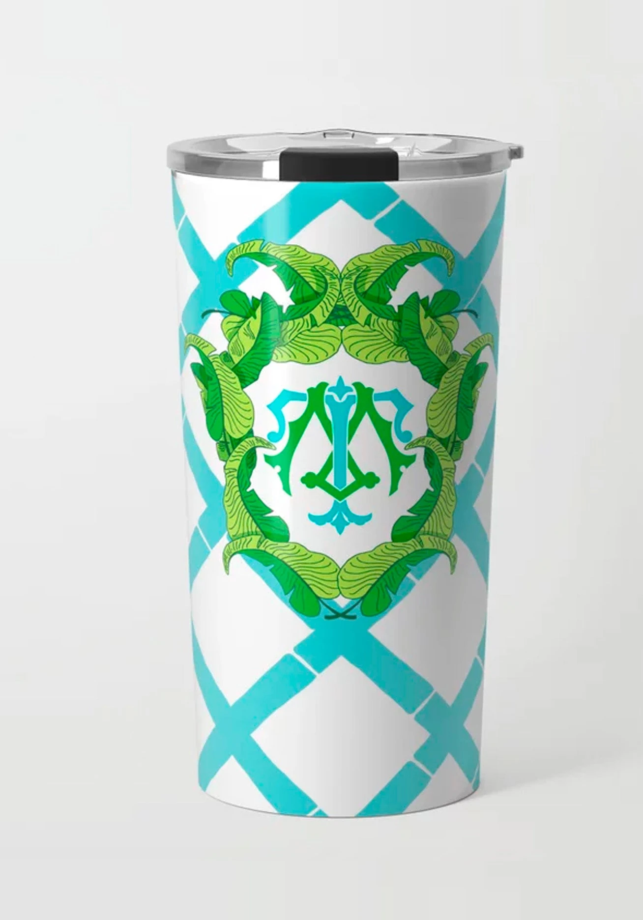 Banana Leaf CrestĀ 20 oz double wall, lightweight stainless steel travel mug with clear plastic insulated lid.Ā Ā Measures 3.5ā diameter x 6.75ā.