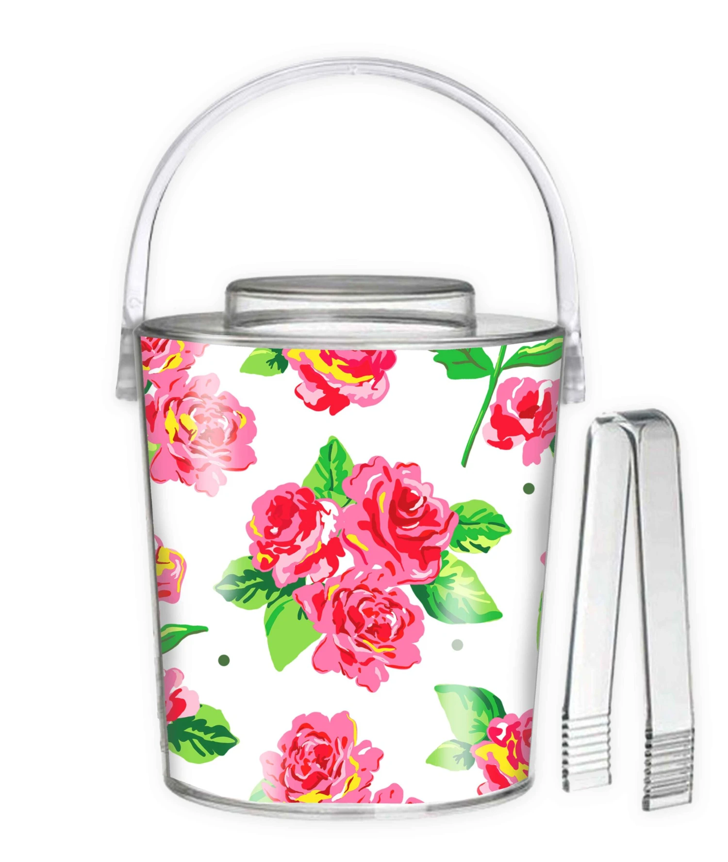 Add a little color to your bar cart with these fabulous acrylic lidded ice buckets!  Artwork is encapsulated in a water-tight space on the inside face of the bucket.  Ice bucket is 3 qt. capacity and measures 7″dia x 8-1/2″H (to top of lid).  One set of acrylic tongs are included.  Hand wash only.
