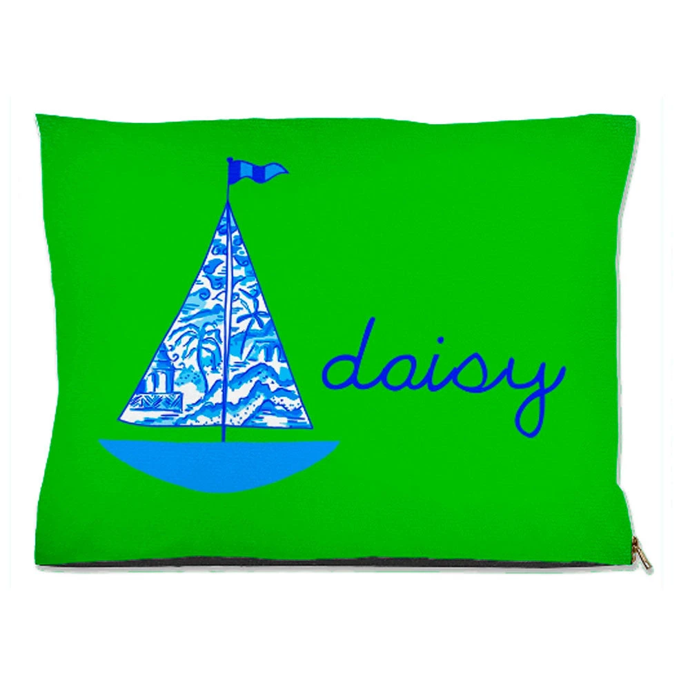 Chinois Sailboat pet bed. Made of indoor/outdoor polyester fabric, the cover is removable with zipper and machine washable (Wash in cold water, tumble dry on low. Do not bleach.) Please note, bottom side of bed is black cotton duck cloth. Bed is made in the USA.