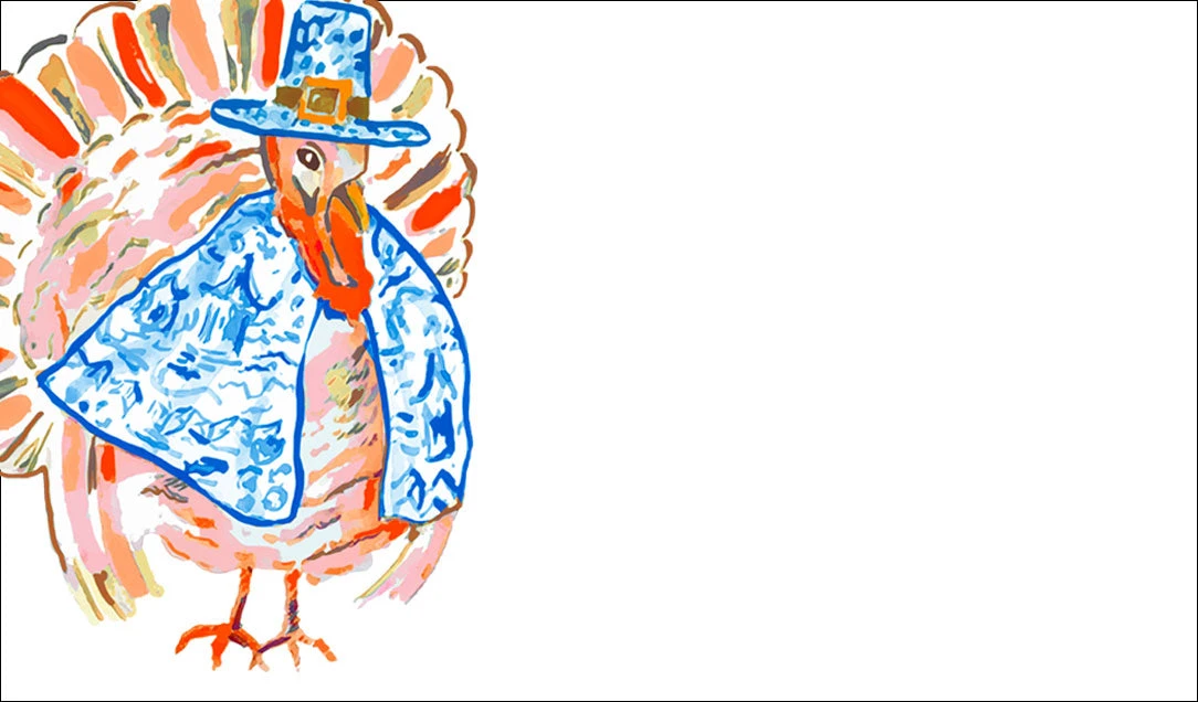 Elevate the sophistication of your set table with our luxe, tented place cards. Designed to pair effortlessly with our full tabletop collection. Blank folded Chinois Turkey Thanksgiving tented Place Cards. Sold in sets of 10 or 20. Cards measure 2.5″ x 3.5″ when folded.  Backside of cards are white. Printed on thick, matte cardstock.