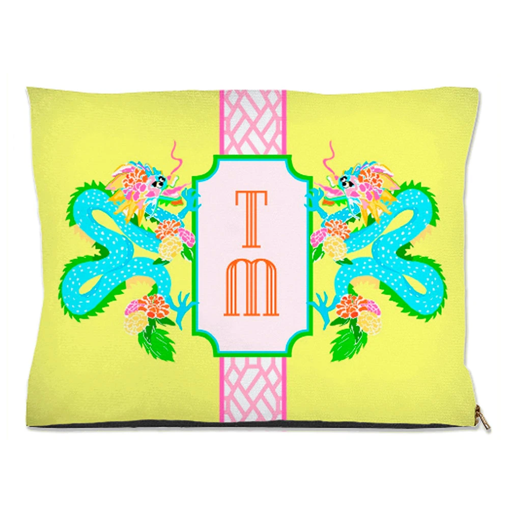 Dragon Crest pet bed. Made of indoor/outdoor polyester fabric, the cover is removable with zipper and machine washable (Wash in cold water, tumble dry on low. Do not bleach.) Please note, bottom side of bed is black cotton duck cloth. Bed is made in the USA.