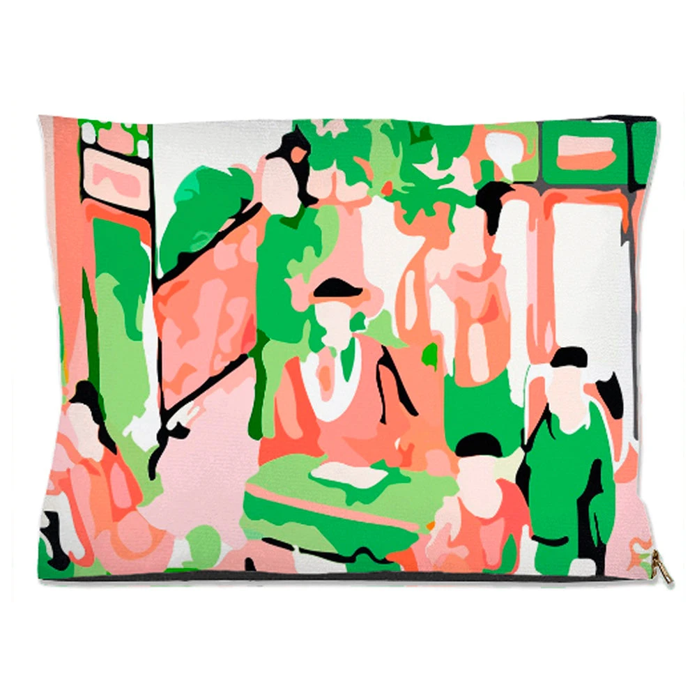 Famille Rose-Inspired pet bed. Made of indoor/outdoor polyester fabric, the cover is removable with zipper and machine washable (Wash in cold water, tumble dry on low. Do not bleach.) Please note, bottom side of bed is black cotton duck cloth. Bed is made in the USA.