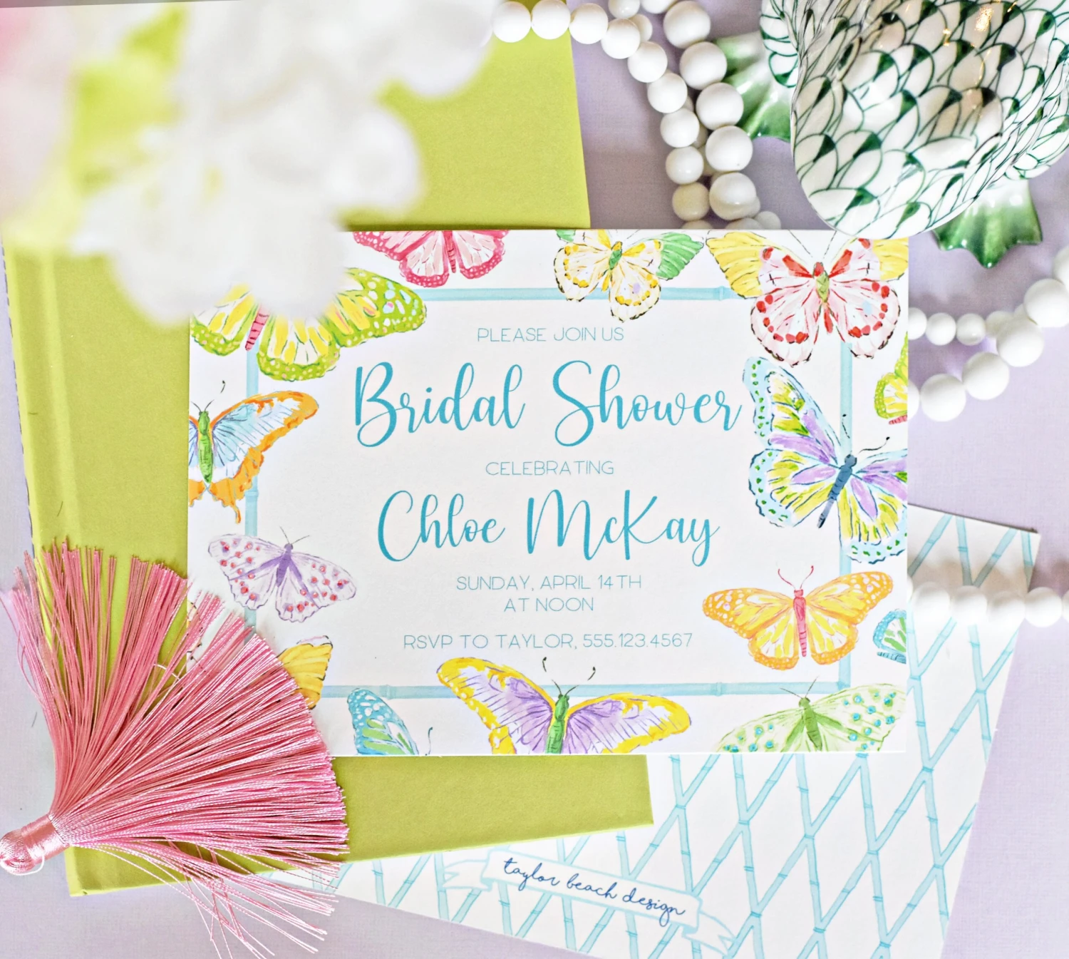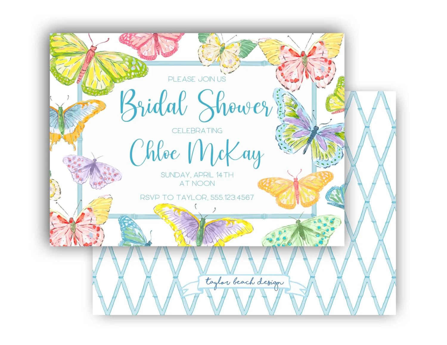 5″x7″ matte finish, flat cards with white envelopes. Backside of invitation is as shown.