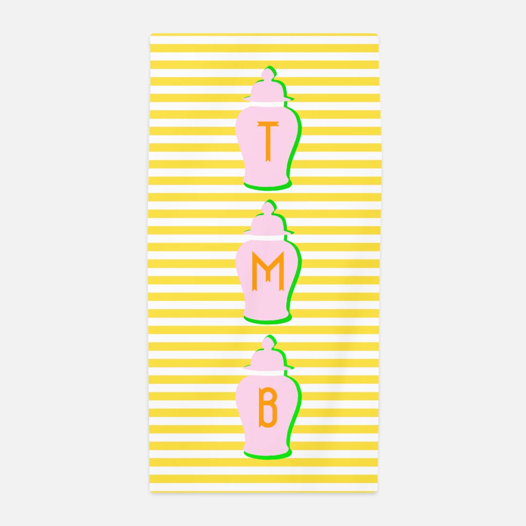 Ginger jar stripe personalized crest beach towel.  Super plush 5.5 oz. sheared microfiber 100% polyester face and reverses to 100% cotton terry loops. Towel measures 30″ x 60″. Design is on front face of towel only. Â