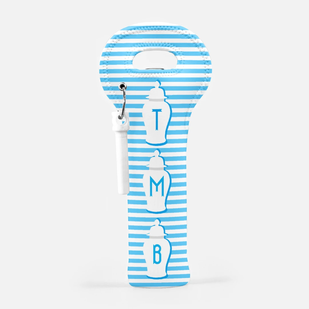 Whether it be a hostess gift or carrying your wine to the boat, this personalized Ginger Jar Stripe wine carrier with cork screw is sure to make an impression. Made of 100% Neoprene material, this bag fits (1) 750ml wine bottle.
