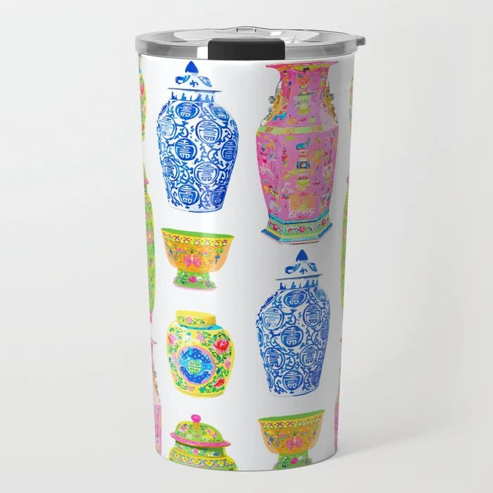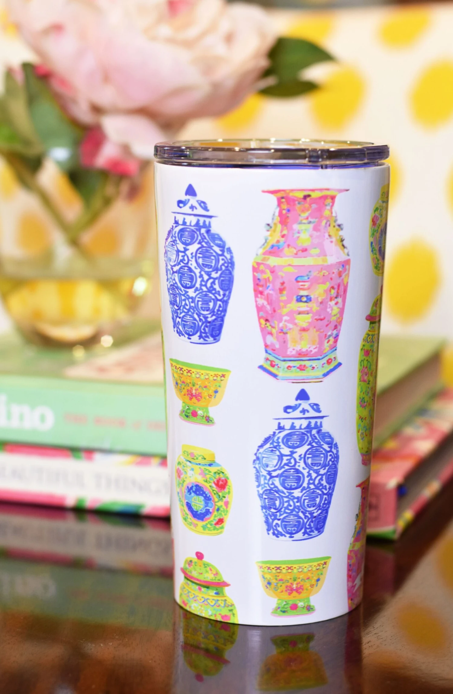 Sip that chai latte from this Haute Chinoiserie travel tumbler.Ā 20 oz double wall, lightweight stainless steel travel mug with clear plastic insulated lid.Ā Ā Measures 3.5ā diameter x 6.75ā.