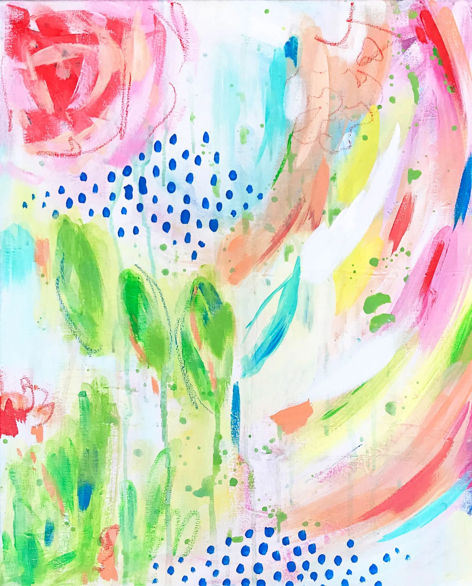 “Hazey Garden,” original, signed abstract artwork in the happiest of acrylic colors. Painting measures 16″x20″ on thin profile gallery-wrapped canvas. Edges of painting are white.
