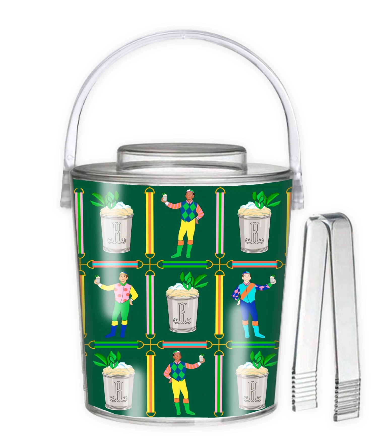 Add a little color to your bar cart with these fabulous acrylic lidded ice buckets! Artwork is encapsulated in a water-tight space on the inside face of the bucket. Ice bucket is 3 qt. capacity and measures 7″dia x 8-1/2″H (to top of lid). One set of acrylic tongs are included. Hand wash only.