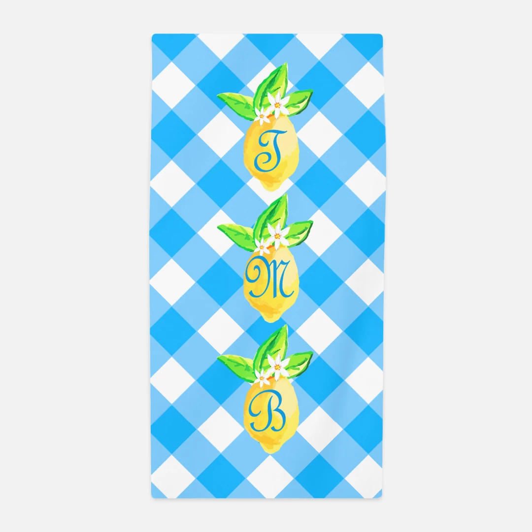 Lovely Lemon beach towel.  Super plush 5.5 oz. sheared microfiber 100% polyester face and reverses to 100% cotton terry loops. Towel measures 30″ x 60″. Design is on front face of towel only. Â