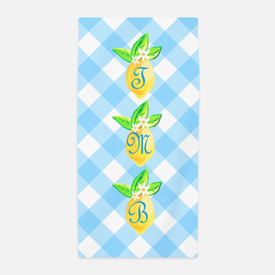 Lovely Lemon beach towel.  Super plush 5.5 oz. sheared microfiber 100% polyester face and reverses to 100% cotton terry loops. Towel measures 30″ x 60″. Design is on front face of towel only. Â