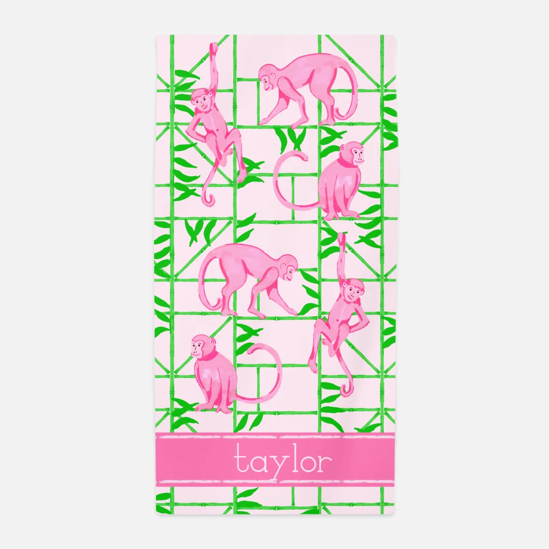 Monkey Trellis polyester face and reverses to 100% cotton terry loops. Towel measures 30″ x 60″. Design is on front face of towel only. Â