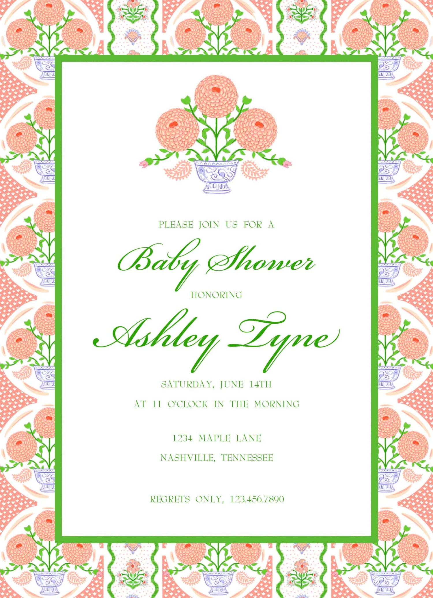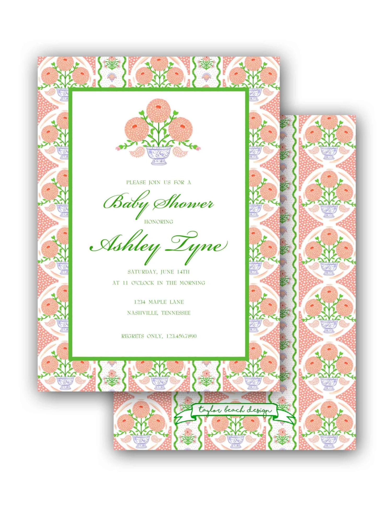 5″x7″ matte finish, flat cards with white envelopes. Backside of invitation is as shown.