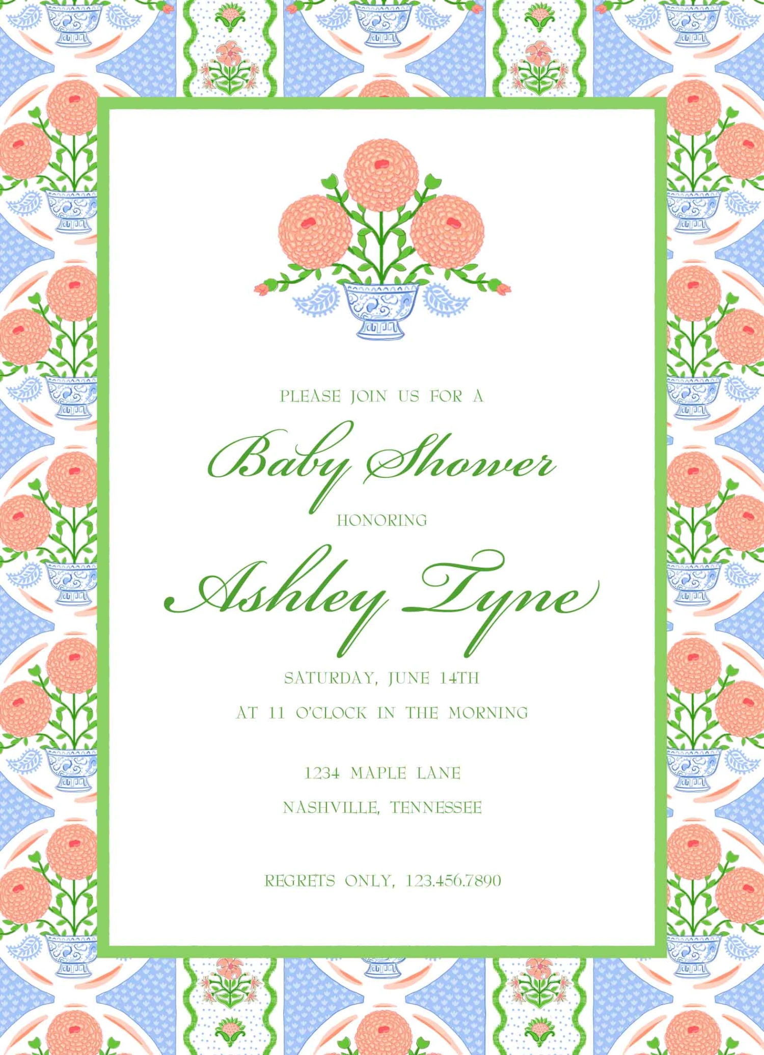 5″x7″ matte finish, flat cards with white envelopes. Backside of invitation is as shown.