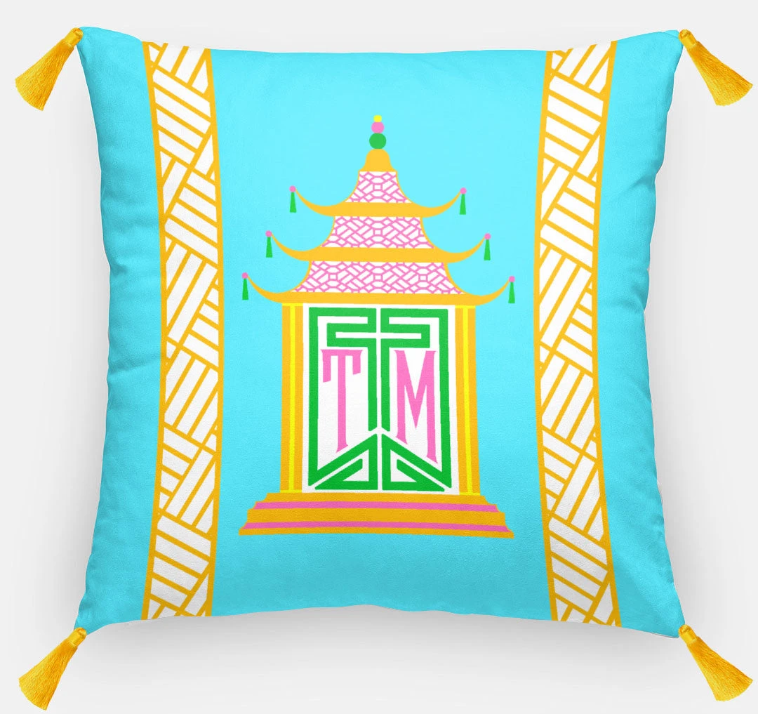 Design your bedroom around this exquisite Royal Pagoda personalized pillow. Pillow measures 26″x26″, has a bottom zipper and comes with a removable feather down insert. Â