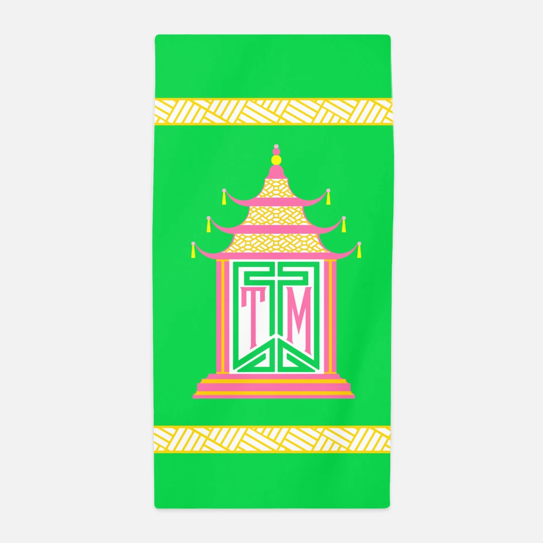 Royal Pagoda beach towel.  Super plush 5.5 oz. sheared microfiber 100% polyester face and reverses to 100% cotton terry loops. Towel measures 30″ x 60″. Design is on front face of towel only. Â
