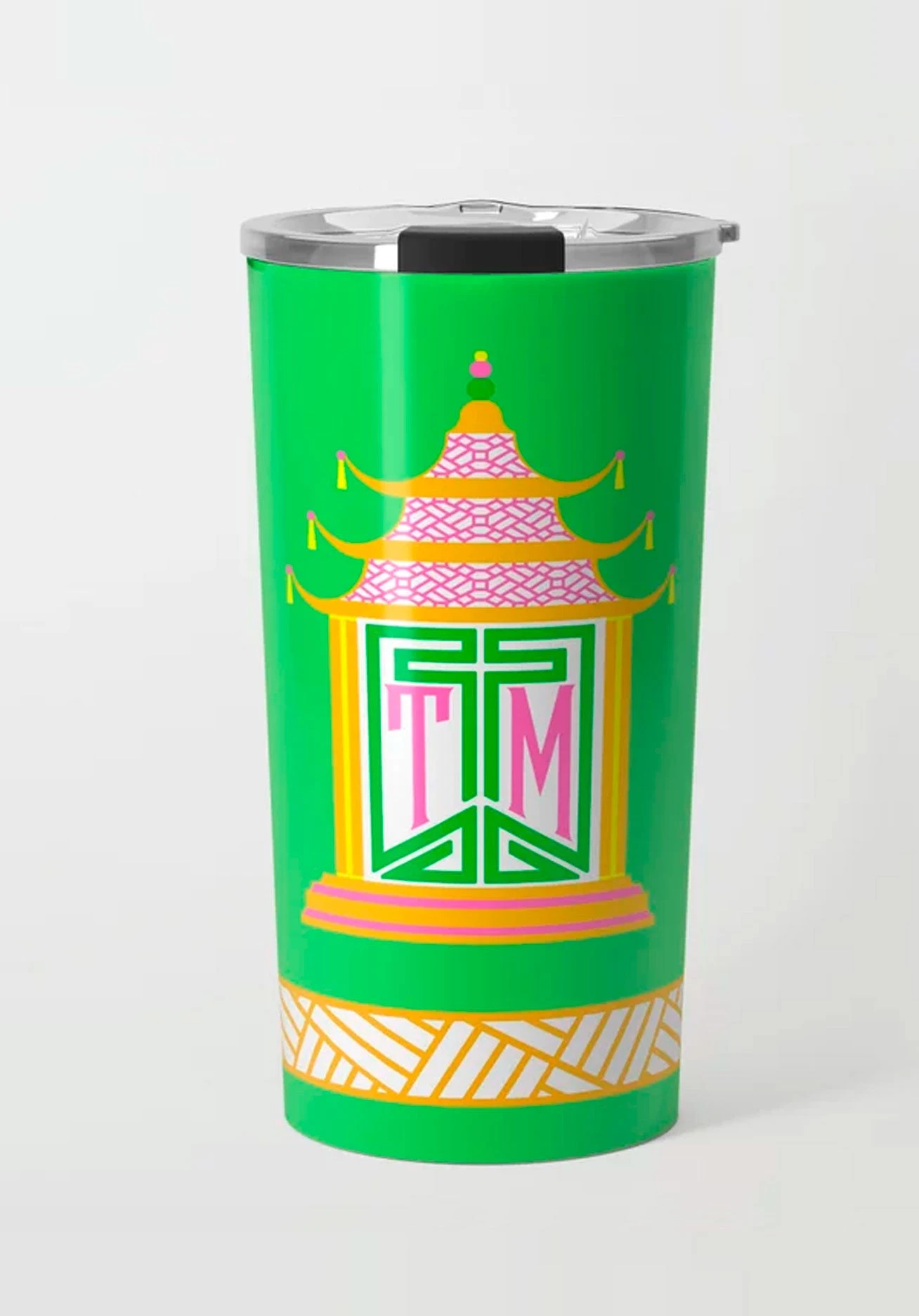 Get your morning off to a great start with this Royal Pagoda travel tumbler.Ā Lightweight double wall, stainless steel with clear plastic lid, this mugĀ is 20 oz and measures 3.5ā diameter x 6.75ā high.Ā Dishwasher safe.