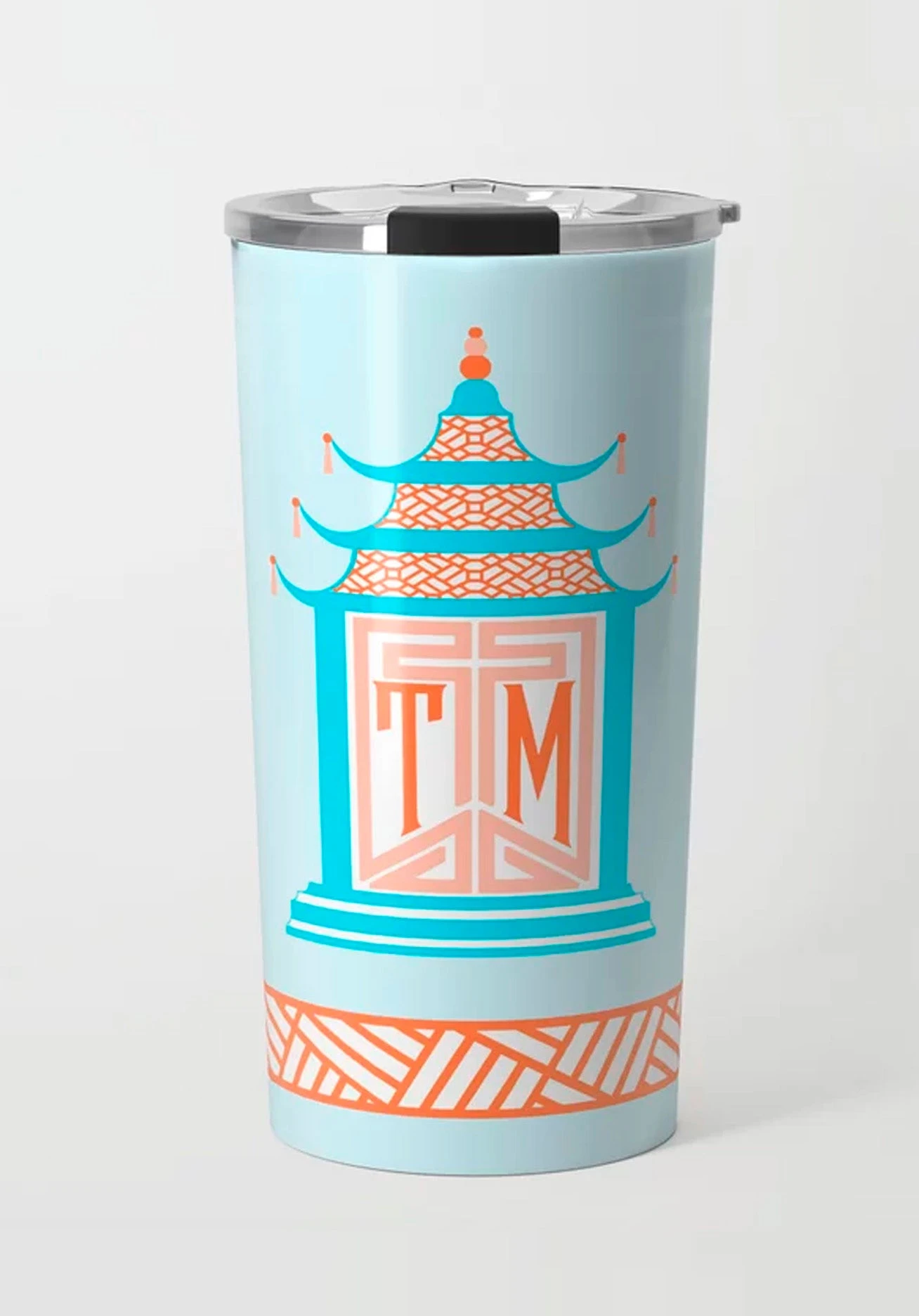Get your morning off to a great start with this Royal Pagoda travel tumbler.Ā Lightweight double wall, stainless steel with clear plastic lid, this mugĀ is 20 oz and measures 3.5ā diameter x 6.75ā high.Ā Dishwasher safe.