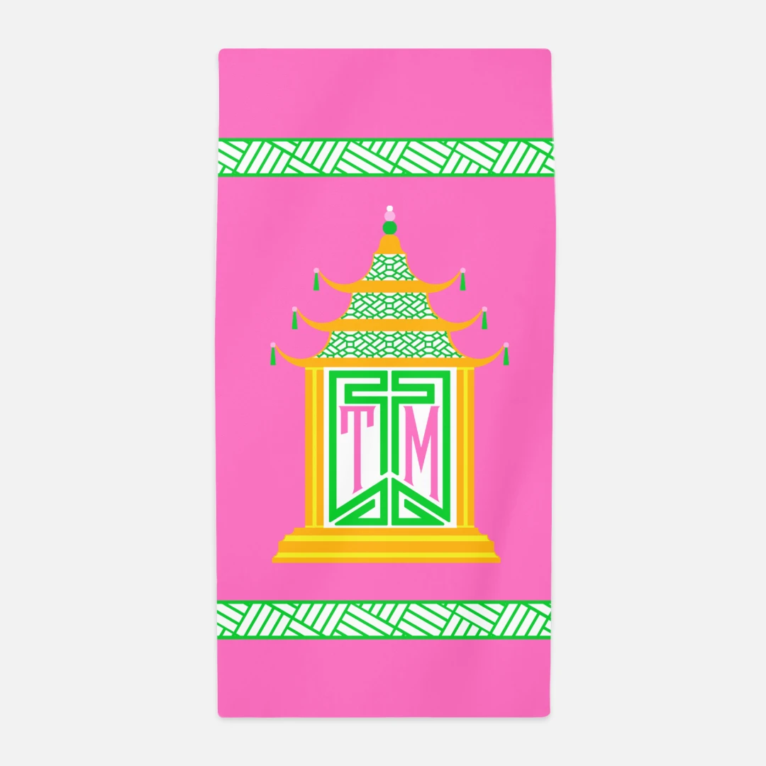 Royal Pagoda beach towel.  Super plush 5.5 oz. sheared microfiber 100% polyester face and reverses to 100% cotton terry loops. Towel measures 30″ x 60″. Design is on front face of towel only. Â