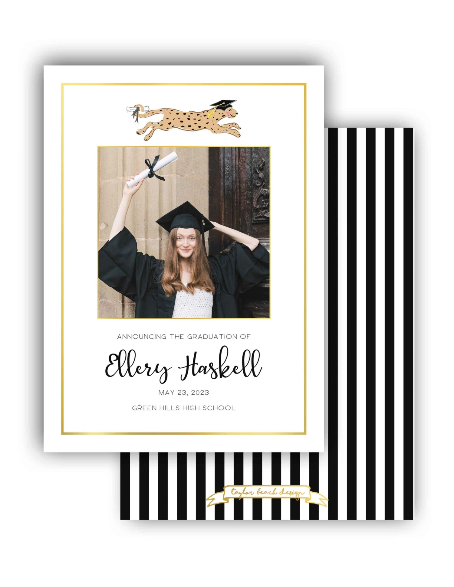 Graduation announcements featuring spotted leopard racing to the finish line with cap and diploma. Backside stipe shown in photo. Announcements are 5″x7″ matte, textured finish, flat cards with white envelopes. Wording may be adjusted to your liking. Please provide verbiage in personalization box. Photo may be uploaded at time of purchase or emailed to [email protected]; please reference order name in email.