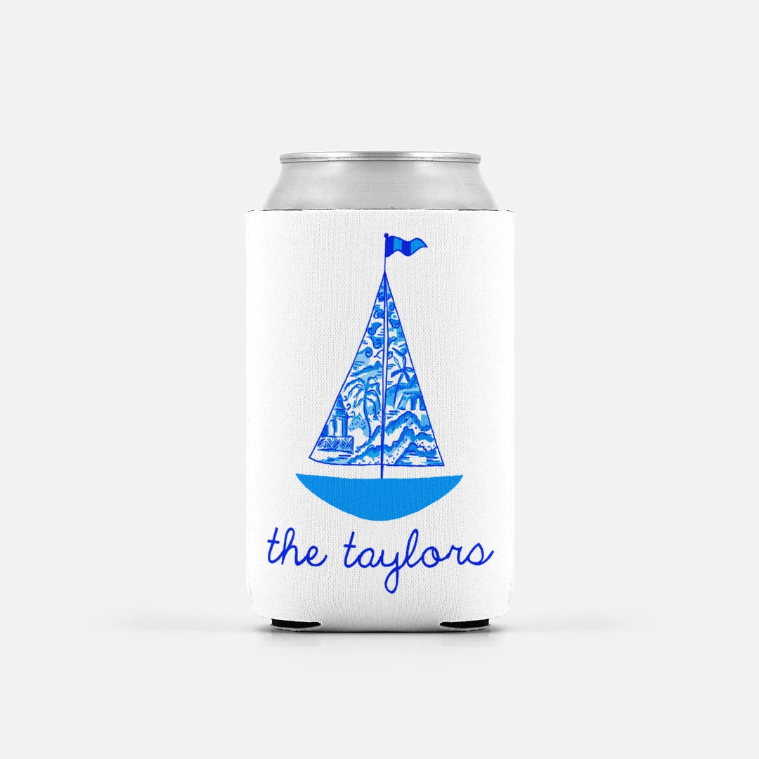 Keep your beverage frosty in these fabulous Chinois Sailboat personalized can coolers. Can coolers are made of neoprene with the design showing up on both sides. These measure 4.75″ x 4.75″ and come in a set of 2.