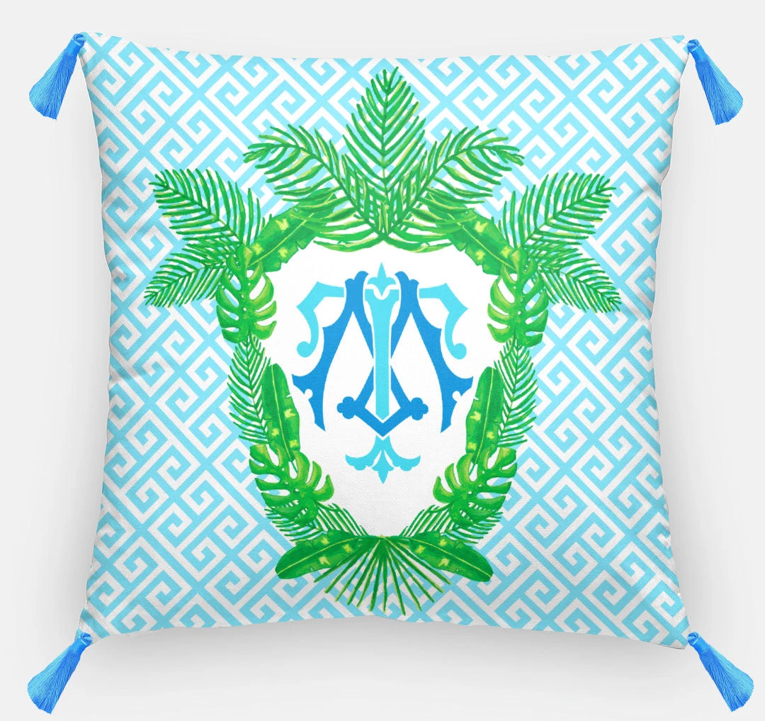 Design your bedroom around this dynamic Tropical Palm Leaf Crest cotton twill pillow. Pillow measures 26″x26″, has a bottom zipper and comes with a removable feather down insert.